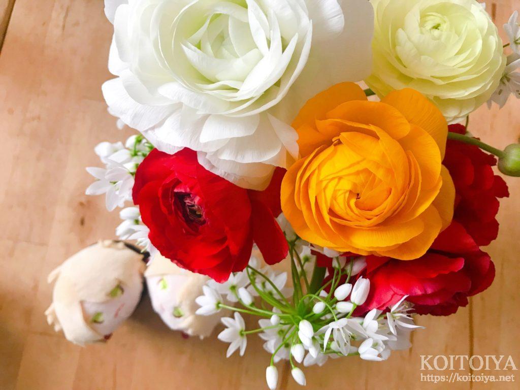 ラナンキュラスの白、赤、黄と、白いアガパンサス(たぶん)